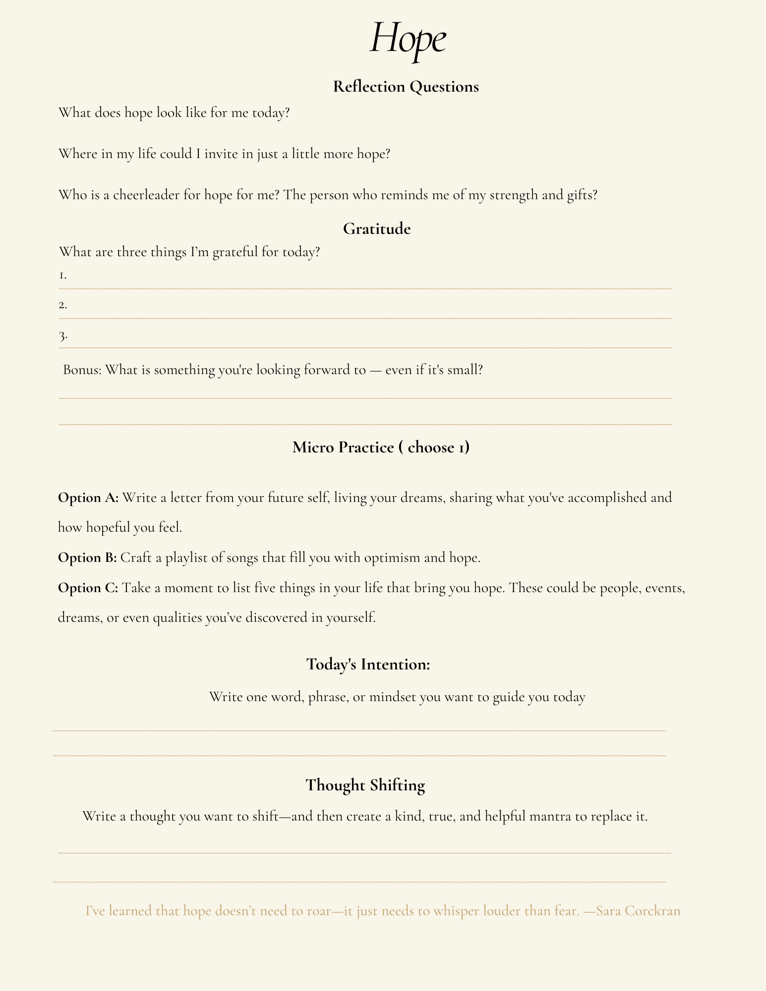 This single journal page is more than lines and prompts—it’s a soft landing place for your thoughts, your hope, and your voice. I created it to help you slow down, listen inward, and begin shifting the stories you tell yourself. It’s a practice in grace, in gratitude, and in planting seeds of change—one word at a time. You don’t need all the answers… just the space to begin.